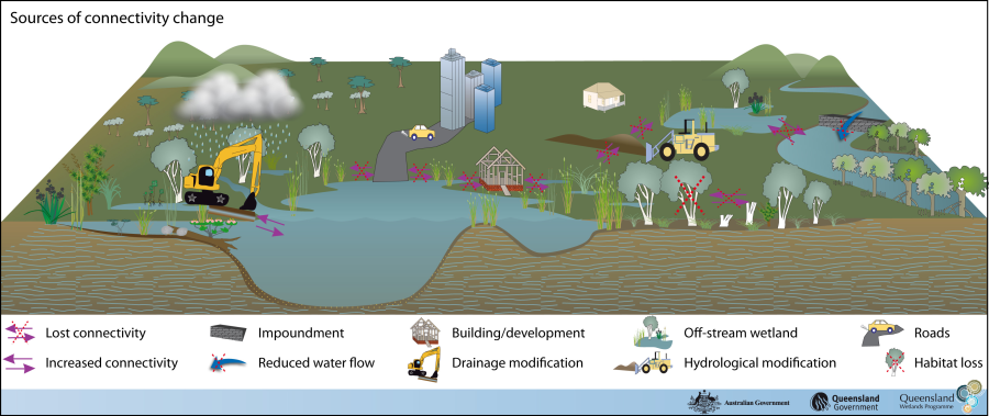 Department of the Environment, Tourism, Science and Innovation, Queensland (2013) Connectivity – Pressures, WetlandInfo website, accessed 15 December 2025. Available at: https://wetlandinfo.detsi.qld.gov.au/wetlands/management/pressures/lacustrine-palustrine-threats/connectivity/pressure.html
