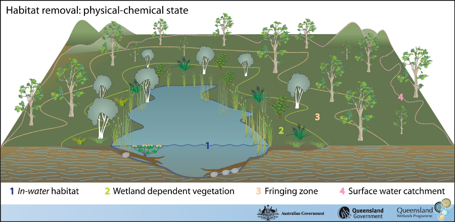 Department of the Environment, Tourism, Science and Innovation, Queensland (2013) Habitat removal – State, WetlandInfo website, accessed 15 December 2025. Available at: https://wetlandinfo.detsi.qld.gov.au/wetlands/management/pressures/lacustrine-palustrine-threats/habitat-removal/state.html