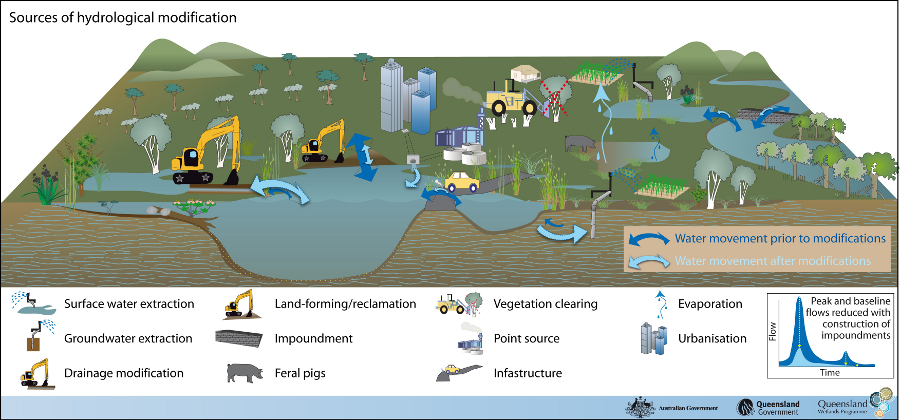 Department of the Environment, Tourism, Science and Innovation, Queensland (2013) Hydrology – Pressures, WetlandInfo website, accessed 15 December 2025. Available at: https://wetlandinfo.detsi.qld.gov.au/wetlands/management/pressures/lacustrine-palustrine-threats/hydrology/pressure.html