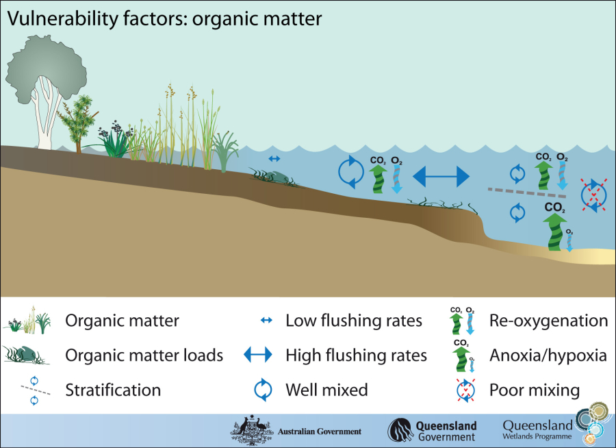 Department of the Environment, Tourism, Science and Innovation, Queensland (2013) Organic matter – Vulnerability, WetlandInfo website, accessed 15 December 2025. Available at: https://wetlandinfo.detsi.qld.gov.au/wetlands/management/pressures/lacustrine-palustrine-threats/organic-matter/vulnerability.html