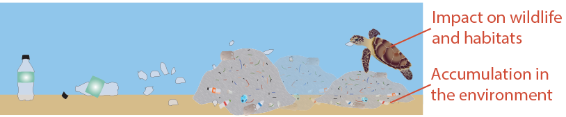 MechanicalCars, trucks, tractors, slashers, bicycles and even lawnmowers break up waste and move it through the environment. For example, collection of kerbside waste bins by rubbish trucks can result in plastic bags, paper and other items blowing out and contributing to residential and roadside litter[3]. It highlights the importance of roads in the mechanical distribution of waste pollution[1]. MechanicalMechanical processes transport waste pollution through the environment, and together with wind, water (i.e. rain) and sunlight (i.e. breakdown of materials making them more transportable), they they also tend to break up persistent material (like plastic) into smaller pieces. These pieces remain in the environment as they do not break down into organically usable forms. For example, a plastic water bottle fragments into smaller and smaller pieces, going from macroplastics, to microplastics and nanoplastics. At each stage, these pose different threats to animals and ecosystems. A study found the presence of microplastics in road dust along an urban to rural transect within South-East Queensland. Concentrations ranged from ~0.5 mg/g in a rural site to 6 mg/g in Brisbane city, with 29% each consisting of polyvinyl chloride and polyethylene terephthalate. There was a strong relationship between the concentration of microplastics in road dust and the volume of vehicles on the road[2].