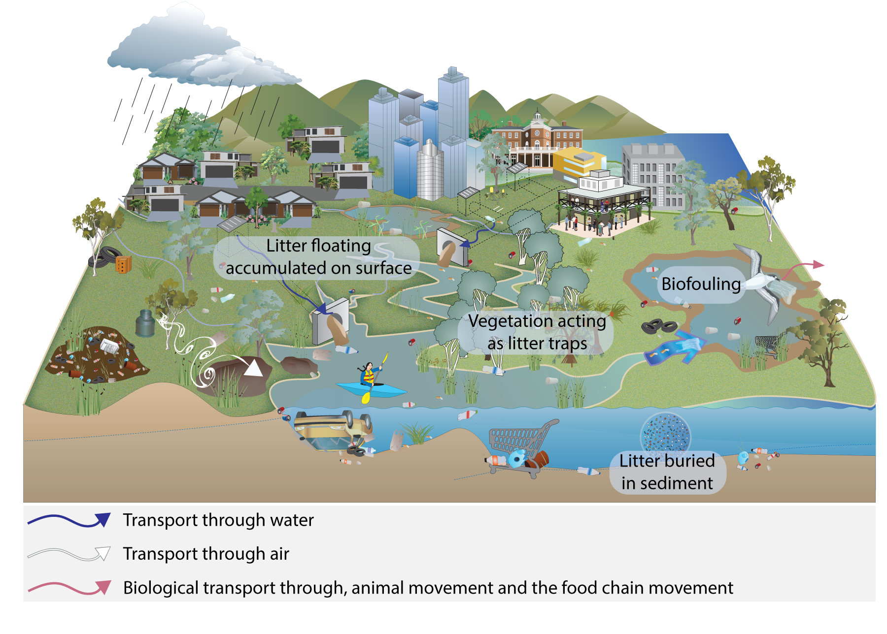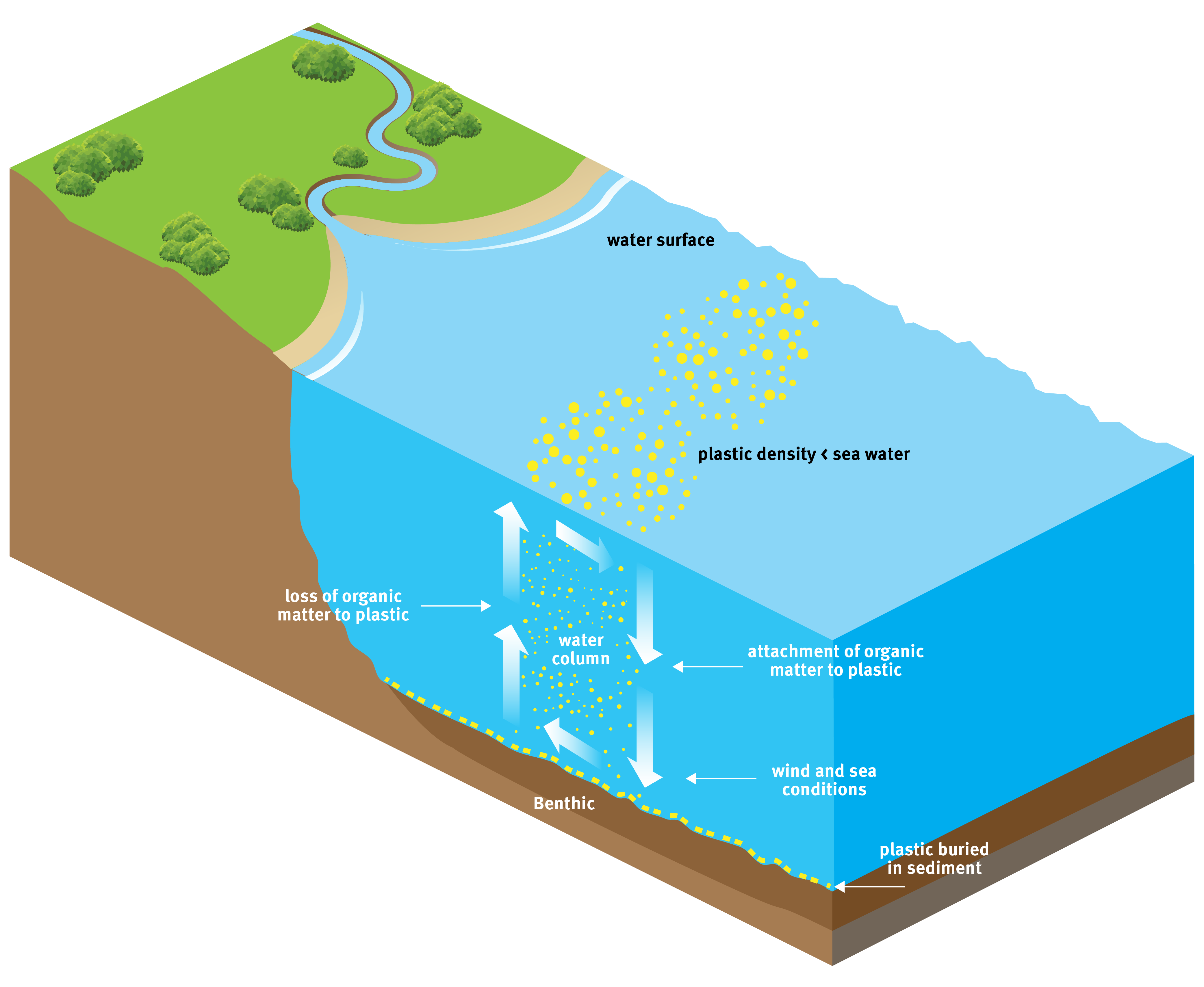 Water columnThe fate of plastic as it breaks up in the ocean and freshwater systems is unclear. It was believed that it either floated or sank. Recent evidence has demonstrated that plastic also exists in the water-column and its buoyancy depends on its make-up and how many organisms attach to it, affecting its density[6]. The attachment of bacteria and algae to plastic is called biofouling. Waste can cycle from the surface through the waste column, to the bottom sediment and up again as it acquires waterborne organisms and other material (see diagram above). Floor (Benthos)The impacts of waste pollution, buried in freshwater sediment, is poorly documented. Most of the existing research has measured plastic, which appears to occur in all water layers including the bottom sediment layer[1][12]. Living things (Biota)Although some studies have investigated plastic in biota in freshwater systems, a 2019 paper suggests that methodologies for understanding the effects of plastic on biota are not standardised and further research is required[10]. One study suggests that the impacts on biota in freshwater systems will mirror those in the marine environment[9]. Vegetated wetlands can act as litter traps, removing large quantities of litter that would otherwise remain in waterways. References