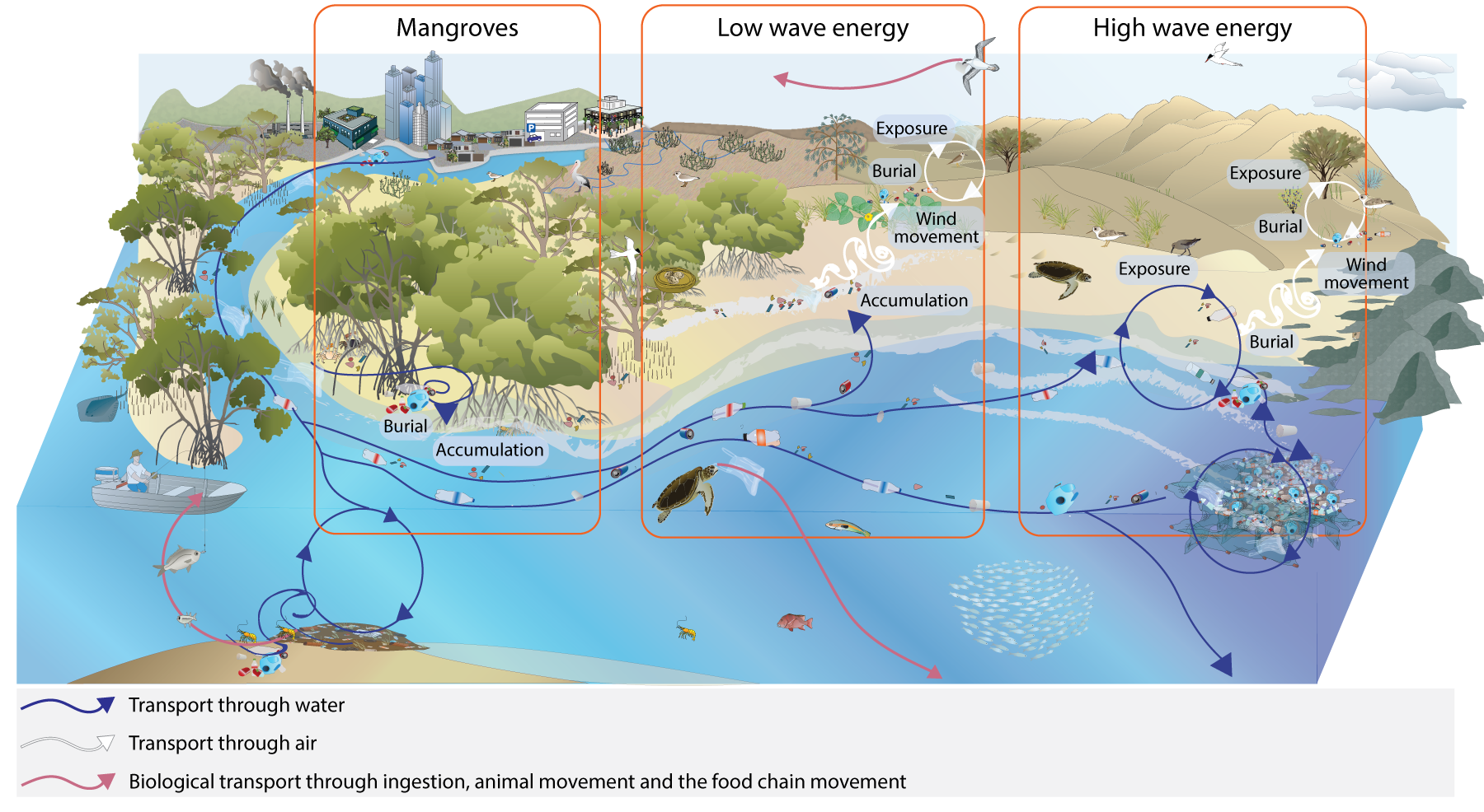 Intertidal![]() High energy shorelinesMuch of the waste that enters the marine environment ends up in the coastal zone. Ocean currents and wind wash much of the waste material back onto the shoreline, making coastlines a major sink for waste pollution[13]. A study found that rainfall contributes to the amount of river litter dispersed along beaches and beach litter loads were the highest during rain events and decreased after rain[16]. Mangroves and low energy shorelinesIntertidal areas, such as mangroves, have also been found to be sinks for marine waste and waste originating from land-based sources[9]. The abundance of waste tends to be higher close to major maritime traffic routes and surface currents[3][9][13].The distribution of waste depends on wind and ocean currents as well as the size of the local population and distance to the nearest road[13]. Numerous studies have shown that the size of plastic debris can vary for different locations. For example, sandy shores can accumulate more plastic pellets than adjacent rocky shores[10]. Both ocean-based activities and surface currents are major drivers, and the waste is more abundant in high-density mangroves.[4][17][9] Onshore winds and water levels can significantly affect the amount of debris on shorelines[13]. Once debris is washed ashore, wind moves waste pollution to the backshore where it gets caught on vegetation[13]. Population density also has an impact on the amount of waste pollution, particularly in communities close to the waterline[13]. Vegetated wetlands, e.g. mangroves, act as litter traps, removing large quantities of litter that would otherwise remain in waterways. Underwater seagrass in coastal areas appear to trap plastic pollution in natural bundles of fibre known as “Neptune balls”.[1] Additional informationPractical actions that can help managers reduce waste pollution in intertidal sinks include:
