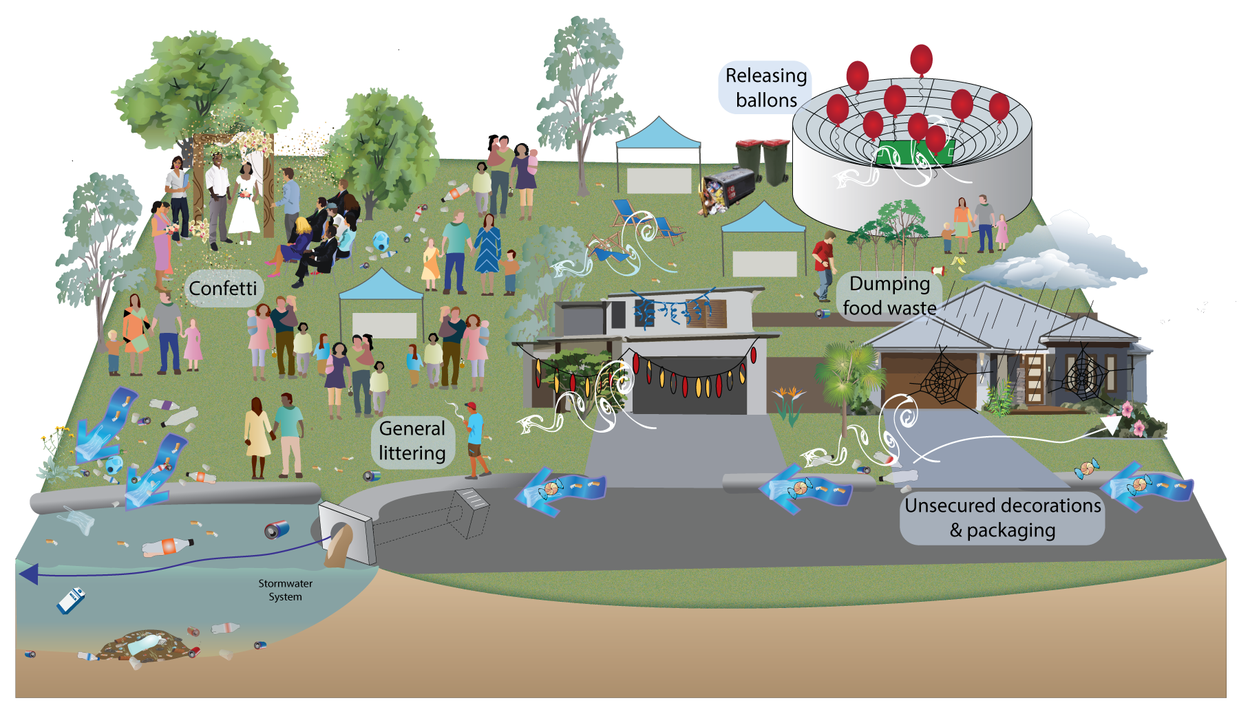 A large amount of waste pollution comes from events and recreation areas. Events include concerts in public parks, weddings, birthday parties, parades, balloon releases and religious festivals. Although councils clean up public spaces, a lot of litter gets blown away by the wind or washed away by stormwater. Halloween is a good example of an event where a great amount of plastic decorations may be dislodged by strong winds. Such unintentional littering can have wide-ranging impacts on human and animal health. Releasing balloons in Queensland is considered littering whether it is deliberate or accidental. Balloons are made of a very strong latex material and do not degrade easily[1]. As a consequence, balloons can end up hundreds of kilometres away, causing great harm to the environment and wildlife[1]. Balloons are deadly to marine life and birds—ingesting them is 32 times more likely than hard plastic to result in death[2]. Suggestions for balloons alternatives (such as bubbles) can be found here. Waste in the recreation and culture sector moves through the environment via four pathways: References