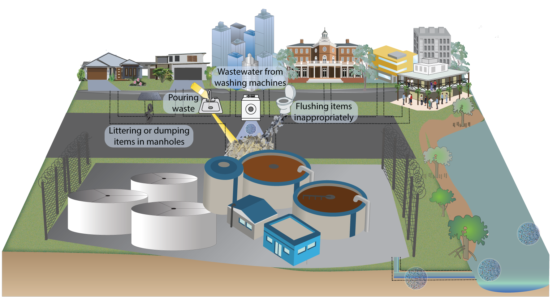 Although there is strict legislation covering sewage in Queensland, damage can still result from the improper disposal of materials down toilets, including plastic bags, sanitary items and chemicals. Small plastic items that are flushed into the sewerage system can get caught in pumps and create blockages, causing overflows and contamination. Illegal dumping down manholes can also damage sewerage infrastructure. As in so many other areas, the presence of microplastics and their flow through sewerage plants is only just being investigated. Microbeads (tiny pieces of plastic) are used as ingredients in many cosmetic products. Many microbeads are too small to be filtered out by wastewater plants and end up flowing into rivers and oceans[2][1]. Oils and fats in the sewerage system can combine to form ‘fatbergs’. These are difficult and expensive to manage, and can cause substantial damage to infrastructure, resulting in system closure and further expense. Waste pollution in the sewerage system moves through the environment via four pathways: References