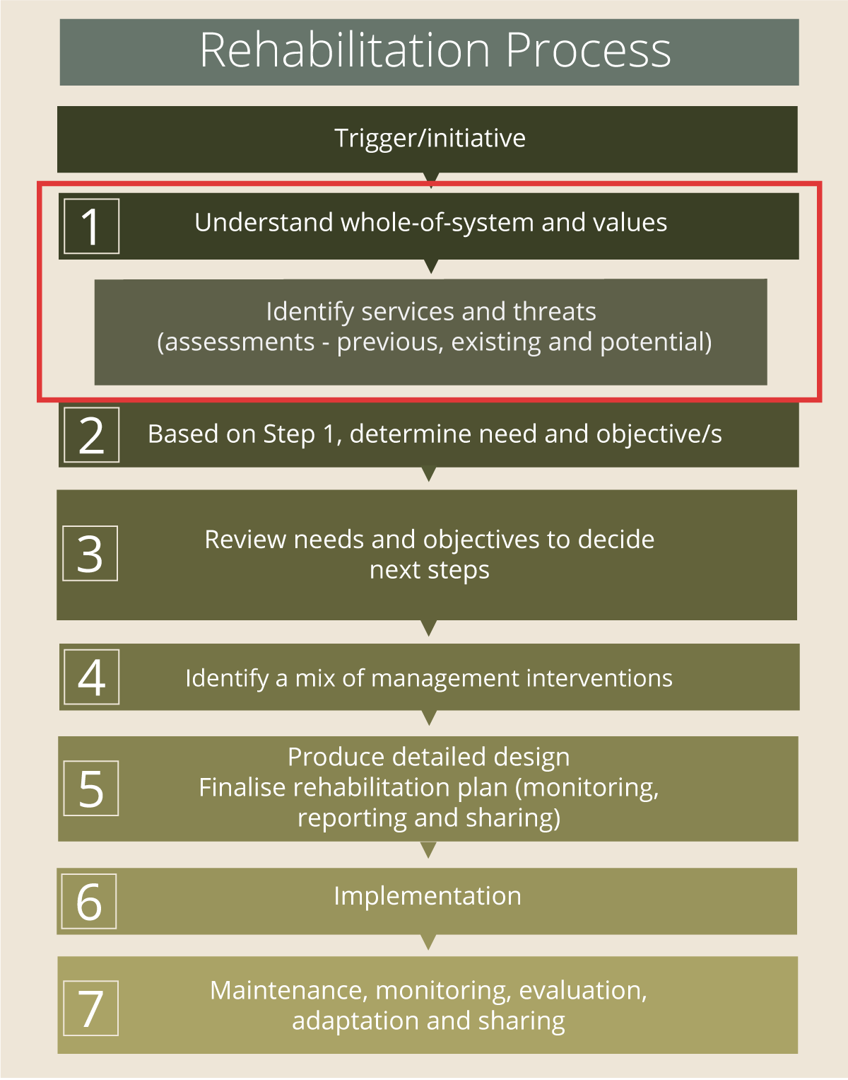 Step 1: Understand whole-of-system and valuesThe Whole-of-System, Values-Based Framework (the Framework) involves identifying the components and processes that make up an ecosystem at multiple scales (spatial and temporal), understanding how these components and processes give rise to ecosystem services (services), and identifying and understanding the values (including intrinsic) and people (stakeholders, beneficiaries) associated with an ecosystem. For example, understanding riparian vegetation in an area (component) and riverine processes (such as flooding) and how the interaction between riparian vegetation and flooding generates services. The Framework requires an understanding of the past, present and future pressures to the services and identifying the actions required to maintain or improve those services and values. The Framework is underpinned by integrated synthesised science, monitoring, evaluation, reporting, improvement and sharing, and communication, capacity building, education participation and awareness. If the processes, components, services, values and pressures are identified for a system, this information can be used to inform any management activities. When planning for the rehabilitation of aquatic ecosystems, it is important to make decisions based on the best available knowledge at several scales. Scale can be spatial (i.e. site, catchment, and broader system-scales) and temporal (i.e. specific climatic seasons and the suitability of rehabilitation during these times). The Framework underpins the Rehabilitation Process to address the need for understanding the system at multiple scales.