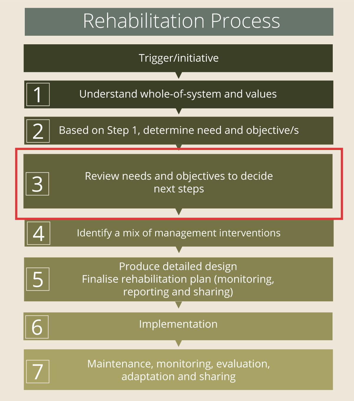 Step 3: Review needs and objectivesThe original intent of a rehabilitation plan may change over time, especially after undertaking Step 2. Step 3 in the Rehabilitation Process applies the information that has been gathered about the system and the site, and reviews the need for rehabilitation, and/or the appropriateness of the original objectives. Why are needs and objectives reviewed?There are several reasons why objectives and management interventions may be reconsidered including: