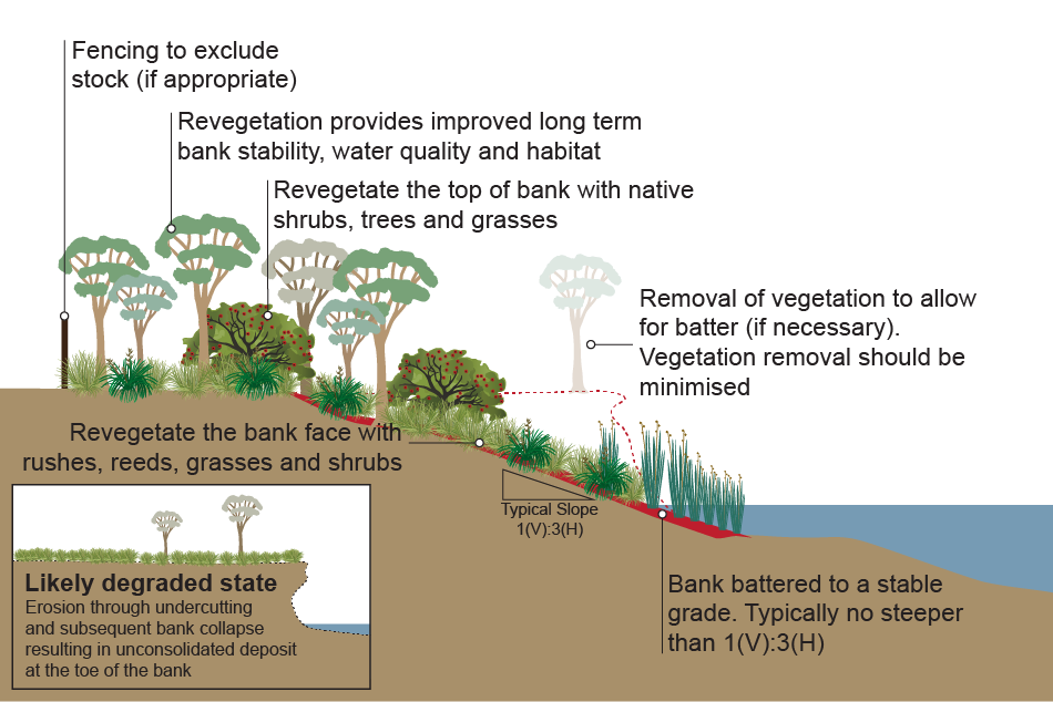 Additional informationPublications: Department of Sustainability and Environment (DSE). 2007. Technical Guidelines for Waterway Management, Department of Sustainability and Environment, Victoria. Last updated: 22 June 2022 This page should be cited as: Department of the Environment, Tourism, Science and Innovation, Queensland (2022) Bank battering, WetlandInfo website, accessed 31 January 2026. Available at: https://wetlandinfo.detsi.qld.gov.au/wetlands/management/rehabilitation/rehab-process/step-4/intervention-options/bank-battering-mod.html |