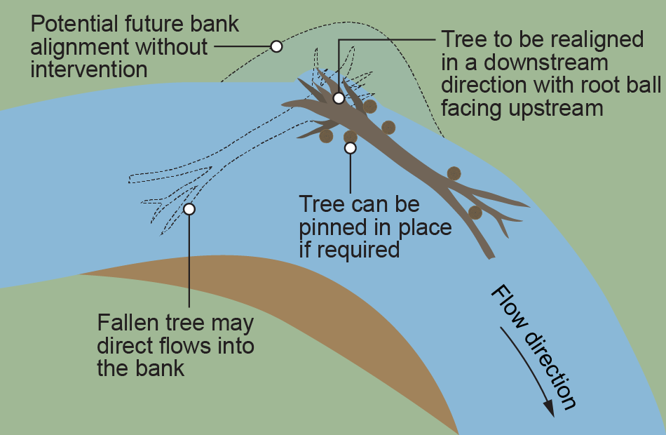 Instream wood managementInstream wood management involves the realignment, relocation and/or removal of instream large wood (> 0.1 metre in diameter and 1 metre in length). In general, it is strongly encouraged to leave instream wood where it is. Instream large wood should only be managed if it has collected to the extent where it threatens infrastructure, or it is directing flows into an exposed bank causing unacceptable erosion. The general aim of managing instream large wood should be to manage the risk that it poses rather than its removal. Therefore, the realignment and relocation of instream wood are preferred management methods. The removal of instream wood should be the last resort. In some high risk circumstances removal may be acceptable, especially if it is an introduced species. These species may not provide the same habitat, hydraulic or geomorphic benefit as native timber. Potential benefits from this intervention: