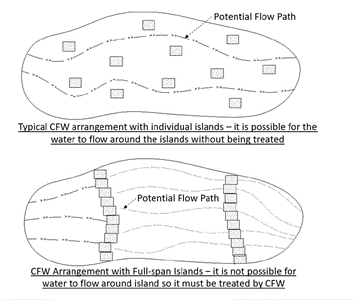 Figure 3 The arrangement of floating wetlands will influence pollutant removal and the image below is recommended to maximise water contact with plant roots and the opportunity for pollutant removal. Image by Lucke et al 2019[2]