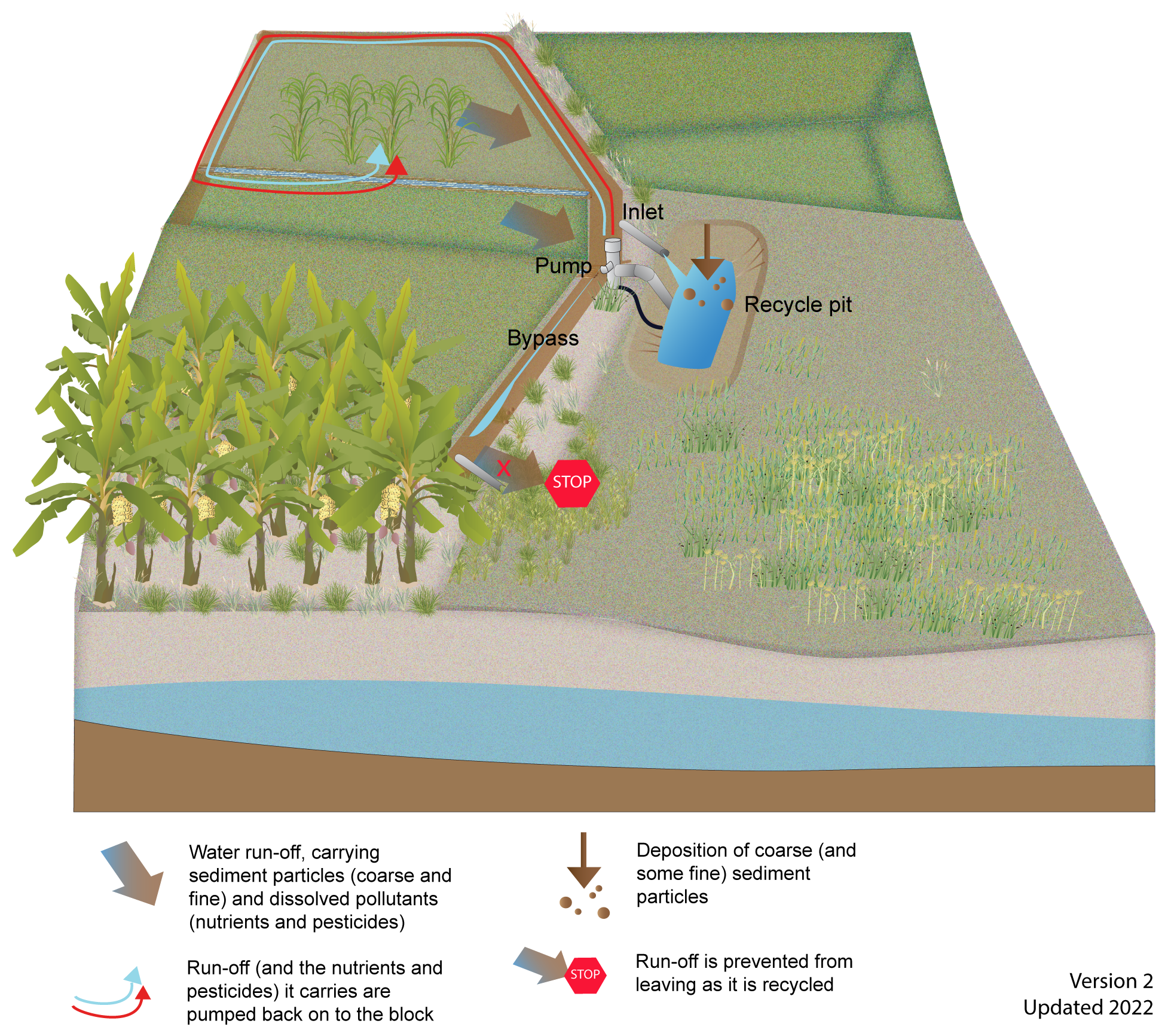 Recycle pitsRecycle pitsSelect from the tabs below Other name/sRecycle basin, tailwater storage pit DescriptionA recycle pit is a structure designed to capture irrigation run-off (known as tailwater) for re-use in the production area. If designed, sited and operated correctly recycle pits can have significant water quantity and quality benefits by ensuring tailwater, and any associated sediments, nutrients and pesticides, are re-used on the farm and do not enter natural waterways and wetlands. Unlike many other treatment systems used in agricultural production systems recycle pits do not treat the water. Rather they rely on the water being captured and re-used on the farm. They are also included as a farm best management practice. Recycle pits are generally used in areas where surface furrow irrigation is used. This is primarily in irrigated sugarcane and broadacre crops, such as cotton[5][4]. Recycle pits are designed primarily to capture irrigation tailwater, but can also capture some stormwater run-off, particularly the first flush of stormwater run-off in irrigated cropping areas[3][1][2]. Services and benefits