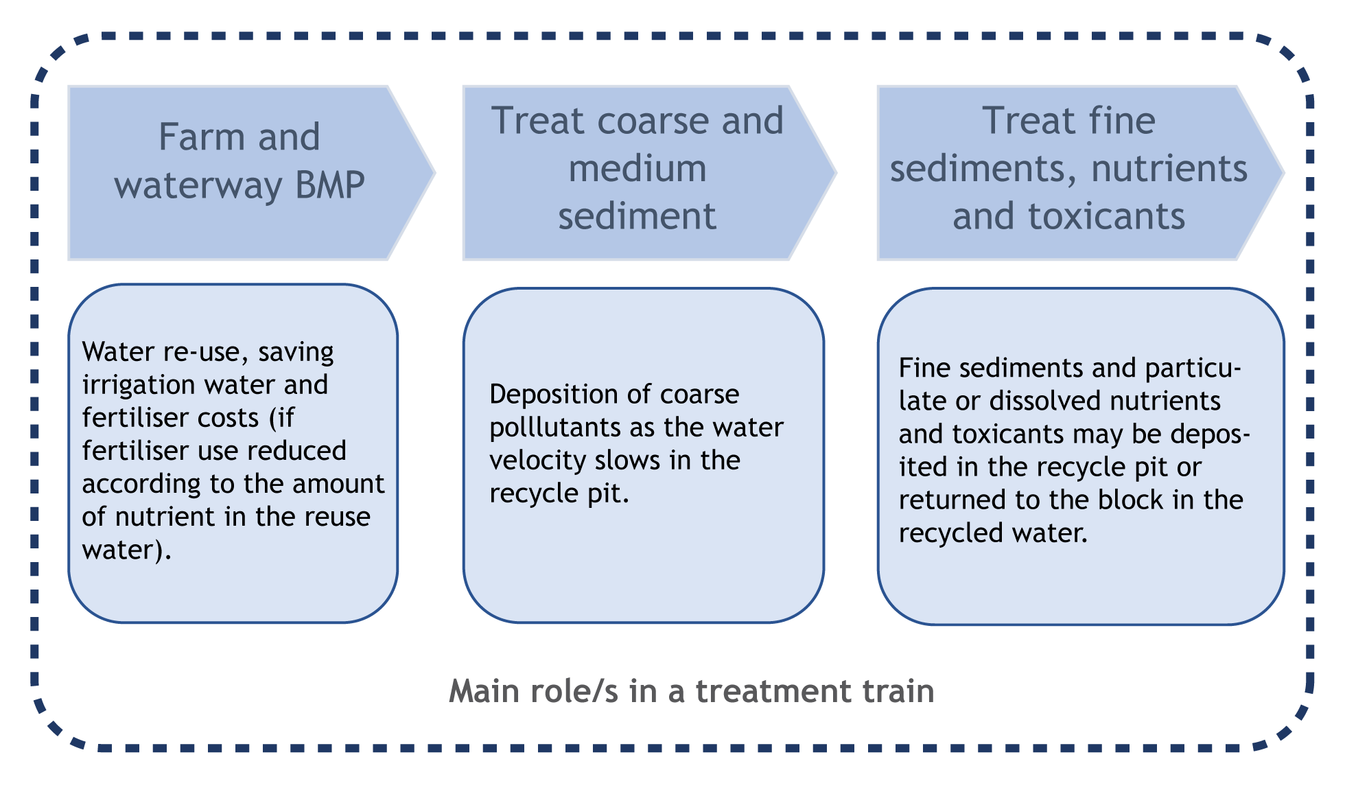 Suitability and limitationsRecycle pits are generally used in areas where surface furrow irrigation results in tailwater run-off. This is primarily in irrigated sugarcane and broadacre cotton and grain crops[3][2] in the Burdekin, Fitzroy and Burnett Mary regions. Recycle pits are also used, although are not as widespread, in other regions such as the Mackay Whitsundays. Approximately 15-20% of the irrigation water applied to sugarcane is lost as run-off[4]. By capturing and reusing this run-off, recycle pits have the potential to significantly reduce the losses of sediments, nutrients and pesticides to downstream waterways. They need to be operated correctly in order to improve water quality. That is, to ensure water is rapidly re-used on the farm and sufficient capacity is maintained in the recycle pit to capture all irrigation tailwater, without overflowing to downstream waterways[1]. Recycle pits can be a cost-effective way to improve water quality and ensure water security. An economic assessment of recycle pits in the lower Burdekin suggests that the combined savings in irrigation water and fertiliser, would allow the farm to recoup the construction costs of recycle pits within four years[5]. The actual cost-effectiveness of recycle pit will vary for each individual site. The cost-effectiveness needs to be considered relative to other treatment systems or management intervention options. Refer to cost considerations for more information. DisclaimerIn addition to the standard disclaimer located at the bottom of the page, please note the content presented is based on published knowledge of treatment systems. Many of the treatment systems described have not been trialled in different regions or land uses in Queensland. The information will be updated as new trials are conducted and monitored. If you have any additional information on treatment systems or suggestions for additional technologies please contact us using the feedback link at the bottom of this page. References