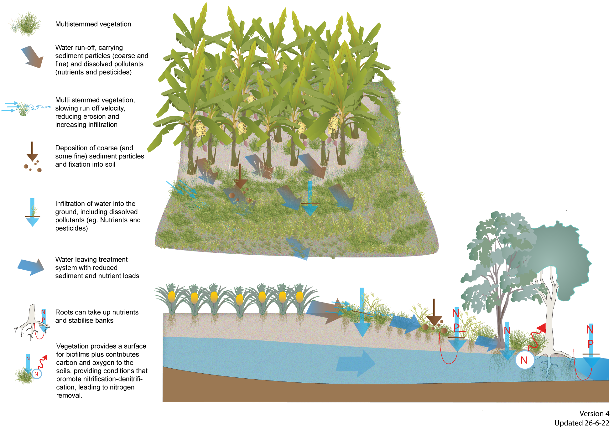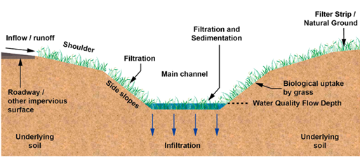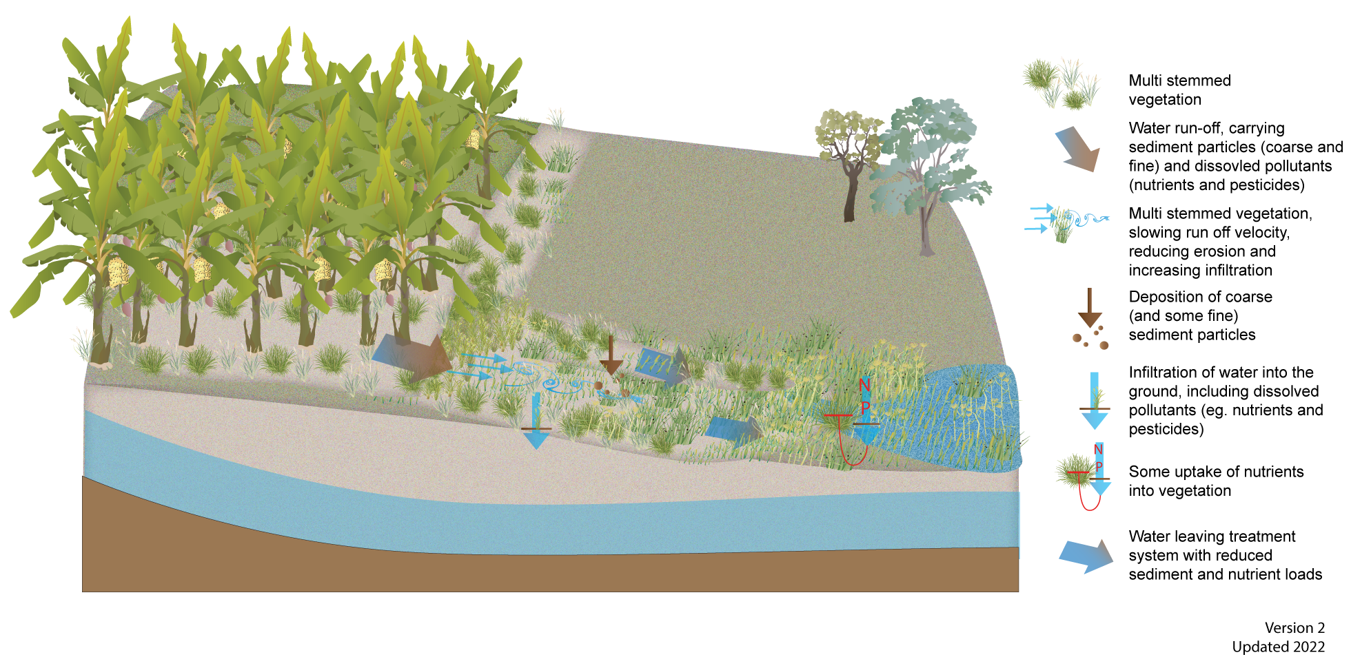 Vegetated buffers and swalesVegetated buffers and swalesSelect from the tabs below Other name/sVegetated buffers and swales, filter strips, riparian buffers DescriptionVegetated buffers and swales for agricultural water quality improvement are drainage features that separate an agricultural production area from a waterway or wetland. Buffers are usually located perpendicular to water flows whereas swales are located parallel to the flow and convey water in a drainage line (as shown in the diagrams above). The difference between swales and drains, is that swales are dry most of the time whereas drains hold water for longer periods. Vegetated buffers and swales are often used as a best management practice tool in agricultural production systems to prevent erosion, such as a grassed interrow or headland. They can have a secondary benefit as a treatment system by slowing water flow and depositing coarse sediment and some nutrients, although their effectiveness in treating agricultural run-off varies depending on site conditions and their design and management[6][7]. Buffers can be efficient at removing nitrogen from groundwater[5], but efficiency is strongly influenced by specific site characteristics, such as groundwater flow paths and soil saturation[5][3] Nitrogen can also be transformed through various processes in a buffer or swale, depending on water flow through the system which will vary seasonally. Most of the content on this webpage focuses on removal of sediments or sediment-bound nutrients in surface run-off. Figure 1 Grass swale cross section showing processes for removing pollutants[2].