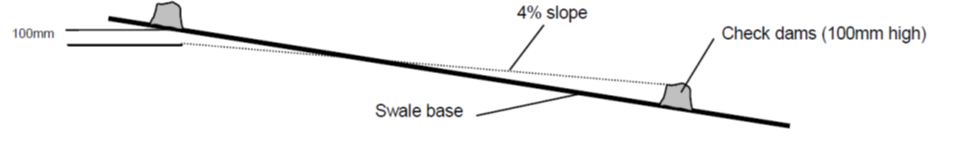 Moderate slope - to be effective at removing sediment, the water flow needs to be slow enough to enable sedimentation and infiltration. On steep land water may flow through the buffer or swale too fast to enable effective water treatment and in these instances a wider buffer or longer swale may be required[4], or a series of level swales with drops or check dams between them (Figure 5). If check dams are used on steeper slopes be careful to avoid scour downstream of and around the check dam[3]. A very flat vegetated buffer or swale can get too waterlogged, causing vegetation damage if there is any vehicle traffic. A review of buffers by Liu et al[4] suggests a 9% slope maximises sediment trapping efficacy, while slopes of less than 3% is preferred for swales.