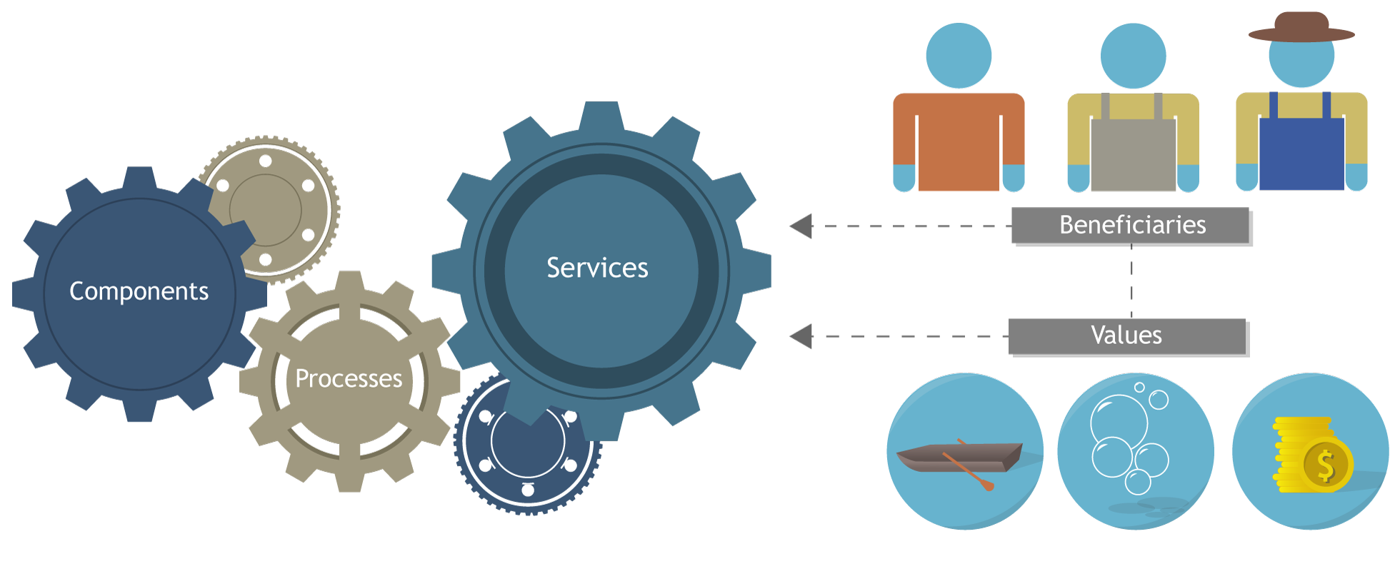 The formation of social, cultural and economic values can be traced from the biophysical components and processes interacting to generate a supply of services that stakeholders interact with[21][23][22] (see also the Whole-of-System, Values-Based Framework). These interactions generate a benefit (e.g. through labour and/or capital goods) that is then valued (individually or collectively) by beneficiaries or stakeholders[17][22][14][8].