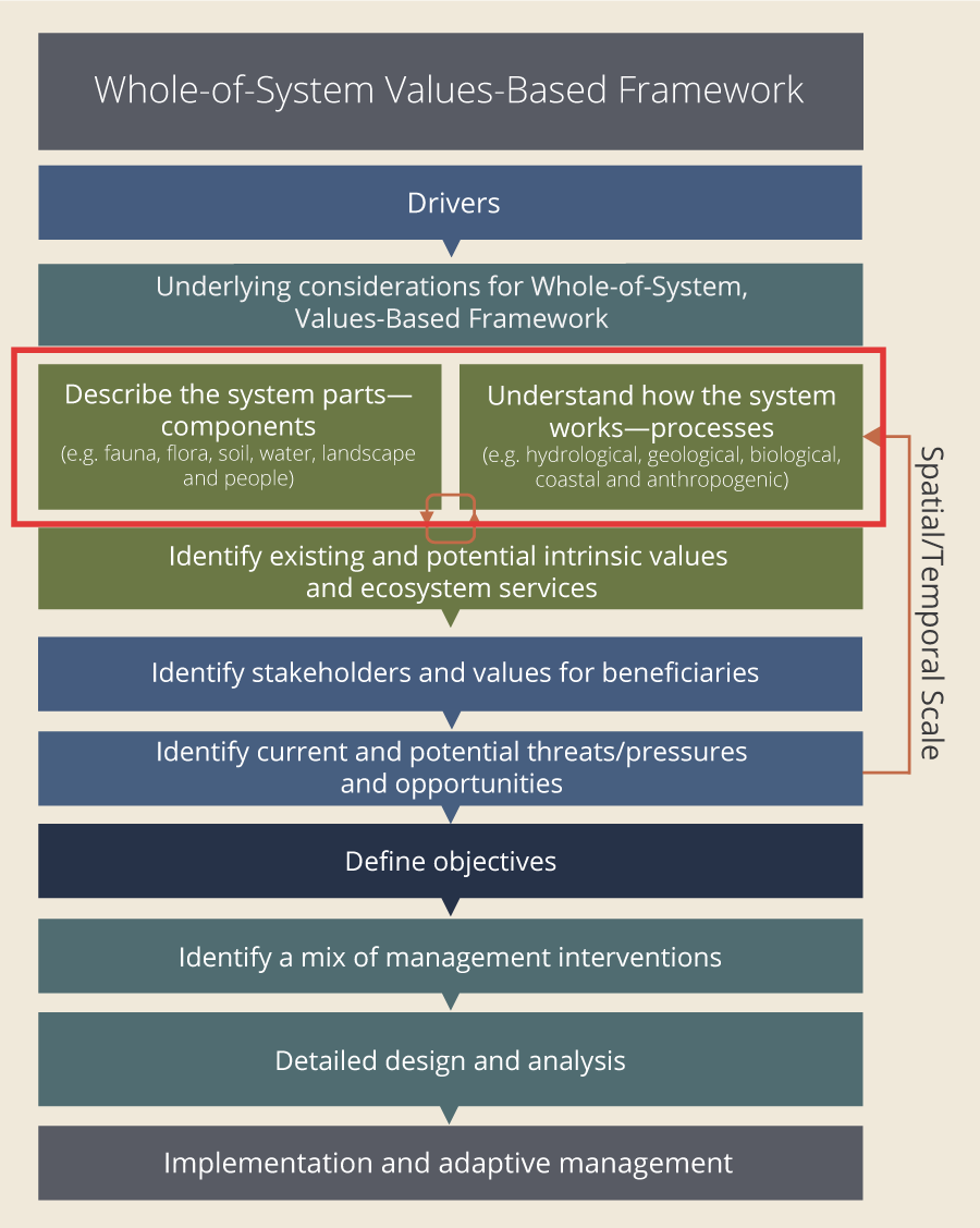 Identify system parts and how the system worksTo implement the Whole-of-System, Values-Based Framework (the Framework), the biophysical (including anthropogenic) aspects (components and processes) of the system must first be identified and documented in a format that is easy to access and easily understood. Ecosystem components (components) are the biophysical and chemical aspects of an environment, such as flora, fauna, soil, water, landscape/topography, people and the built environment. Components can be identified using scale-appropriate assessment methods (e.g. site, catchment, landscape), such as wetlands mapping, land use mapping, species records, etc.. For example, the components in the Lower Burdekin might include mangroves, salt marshes, sea grasses, cane farms, irrigation drains, roads, turtles, fish, crabs, and crocodiles. Ecosystem processes (processes) are the physical, ecological, chemical, and hydrological processes that help form, maintain, and support a system. It is essential to understand how a system works across multiple scales to appropriately manage its biophysical aspects and understand how those biophysical aspects give rise to the services that are valued by humans[1]. One method of identifying and synthesising an understanding of the processes and components in a landscape is through ‘Walking the Landscape’. Other processes can be understood and quantified through modelling. Examples of processes that might be identified or assessed include understanding how water flows through the system, how the system responds to climatic processes (e.g. storms, floods), and nitrogen processes. References