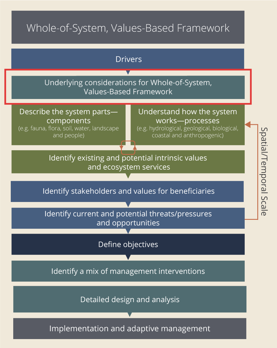 Last updated: 30 June 2022 This page should be cited as: Department of the Environment, Tourism, Science and Innovation, Queensland (2022) Underlying considerations for Whole-of-System, Values-Based Framework, WetlandInfo website, accessed 15 December 2025. Available at: https://wetlandinfo.detsi.qld.gov.au/wetlands/management/whole-system-values-framework/key-principles.html |