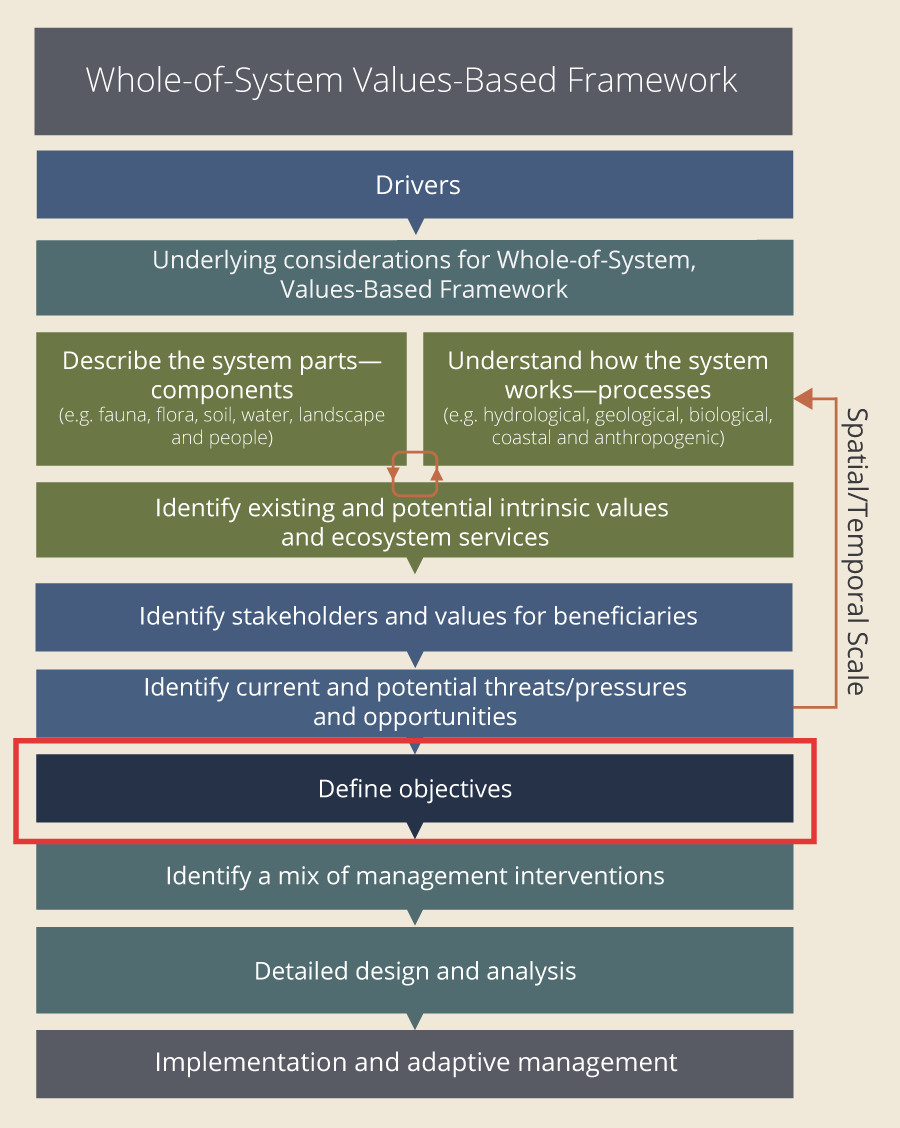 - develop objectives for the appropriate time frames (e.g. short-term and/or long-term) and spatial scales (e.g. will the objectives achieve the intended outcomes in the preferred time frame and spatial scale?)