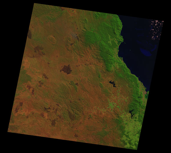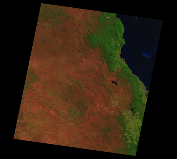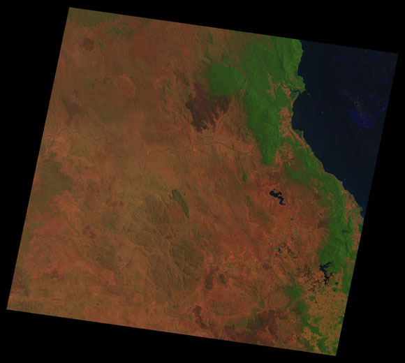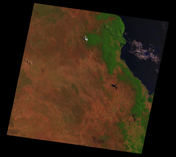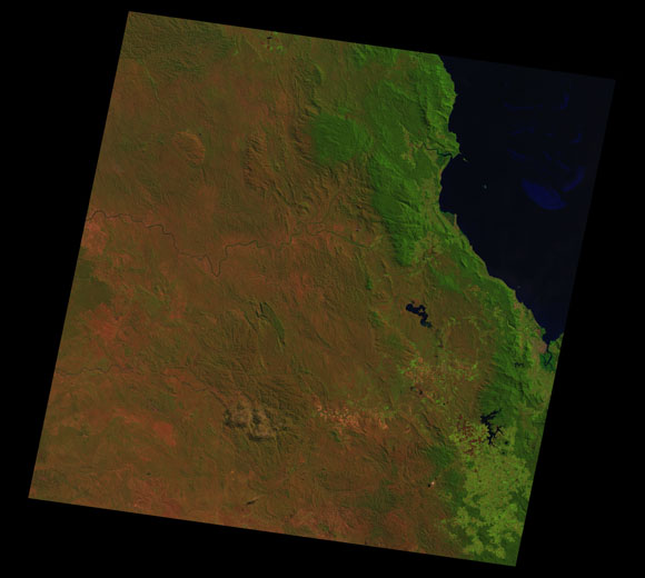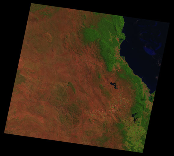 Atherton Landsat SceneImages are colour-mapped to enhance the contrast of water bodies (Shortwave→Red, Near-infrared→Green, Green→Blue) Copyright Commonwealth of Australia - Geoscience Australia. Imagery post-processed by DETSI. This page should be cited as: Department of the Environment, Tourism, Science and Innovation, Queensland (2013) Atherton Landsat Scene, WetlandInfo website, accessed 15 December 2025. Available at: https://wetlandinfo.detsi.qld.gov.au/wetlands/resources/tools/hydro-climate/scene/athe/ |
