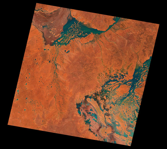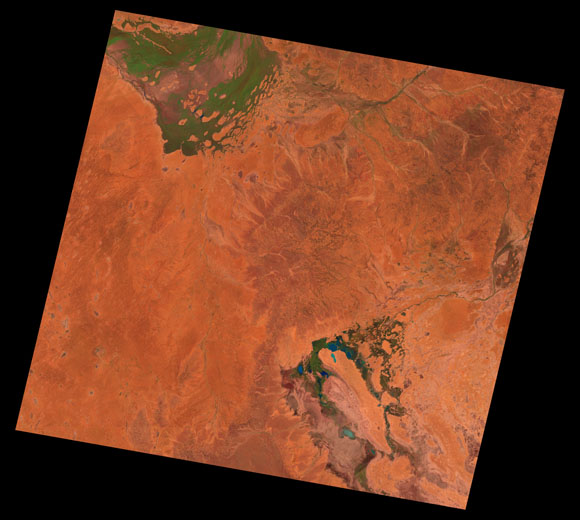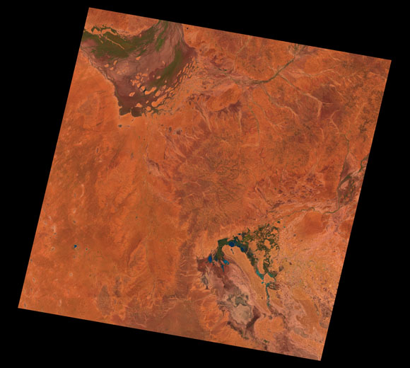 Bransby Landsat SceneWRS path/row: 96/79-80 Images are colour-mapped to enhance the contrast of water bodies (Shortwave→Red, Near-infrared→Green, Green→Blue) Copyright Commonwealth of Australia - Geoscience Australia. Imagery post-processed by DETSI. This page should be cited as: Department of the Environment, Tourism, Science and Innovation, Queensland (2013) Bransby Landsat Scene, WetlandInfo website, accessed 15 December 2025. Available at: https://wetlandinfo.detsi.qld.gov.au/wetlands/resources/tools/hydro-climate/scene/bran/ |