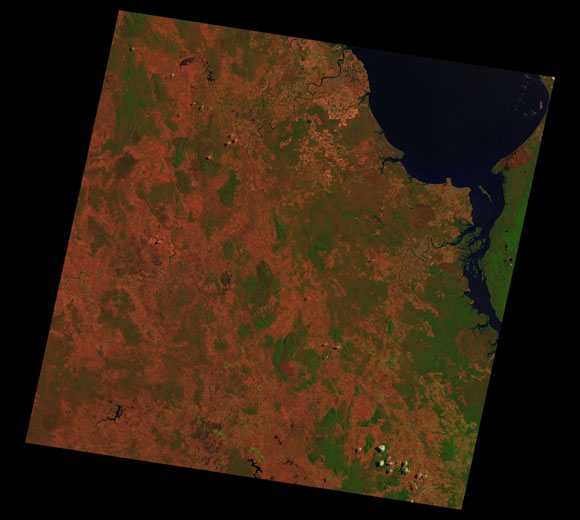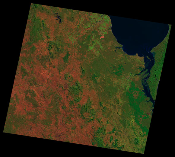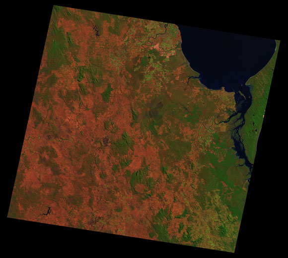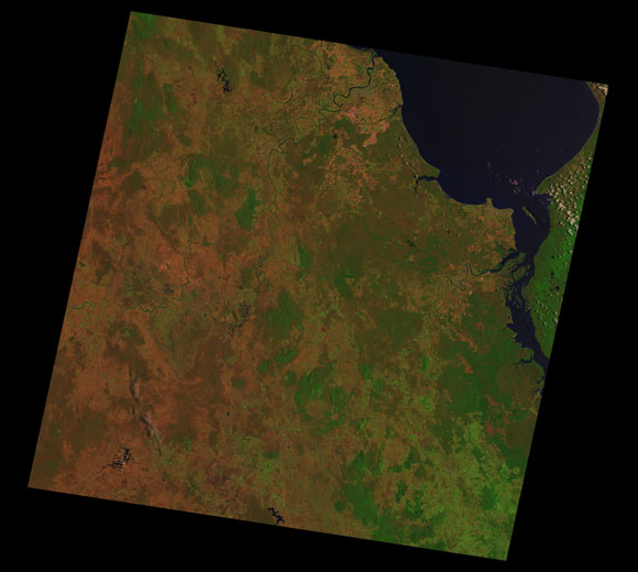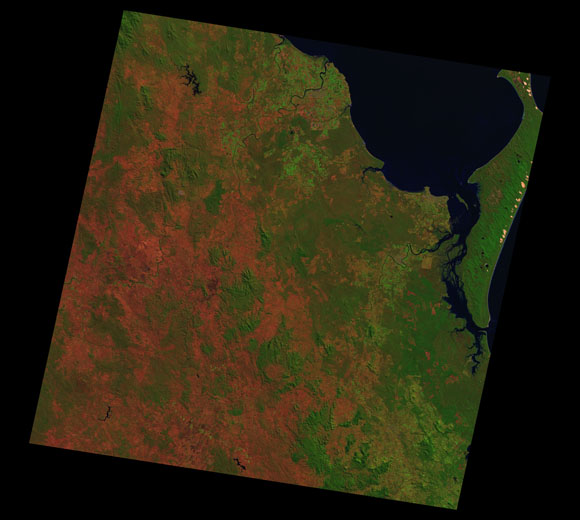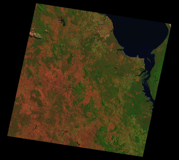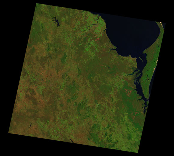 Bundaberg Landsat SceneImages are colour-mapped to enhance the contrast of water bodies (Shortwave→Red, Near-infrared→Green, Green→Blue) Copyright Commonwealth of Australia - Geoscience Australia. Imagery post-processed by DETSI. This page should be cited as: Department of the Environment, Tourism, Science and Innovation, Queensland (2013) Bundaberg Landsat Scene, WetlandInfo website, accessed 15 December 2025. Available at: https://wetlandinfo.detsi.qld.gov.au/wetlands/resources/tools/hydro-climate/scene/bund/ |