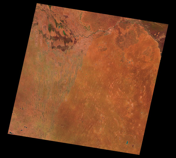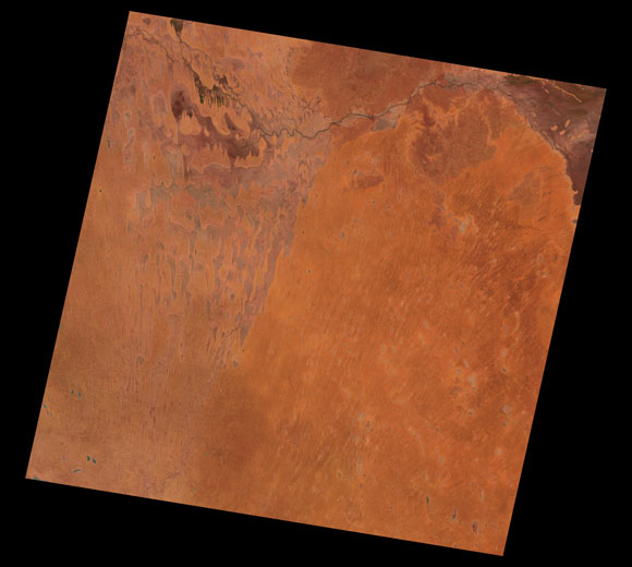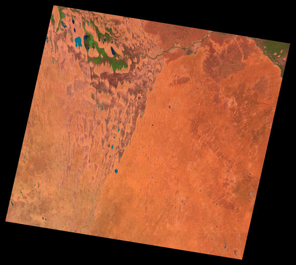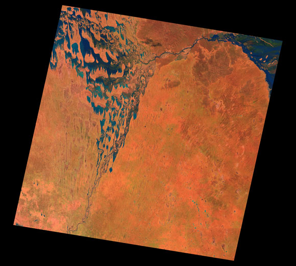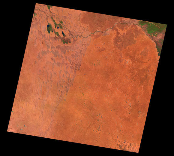 Cameron Corner Landsat SceneImages are colour-mapped to enhance the contrast of water bodies (Shortwave→Red, Near-infrared→Green, Green→Blue) Copyright Commonwealth of Australia - Geoscience Australia. Imagery post-processed by DETSI. This page should be cited as: Department of the Environment, Tourism, Science and Innovation, Queensland (2013) Cameron Corner Landsat Scene, WetlandInfo website, accessed 15 December 2025. Available at: https://wetlandinfo.detsi.qld.gov.au/wetlands/resources/tools/hydro-climate/scene/came/ |