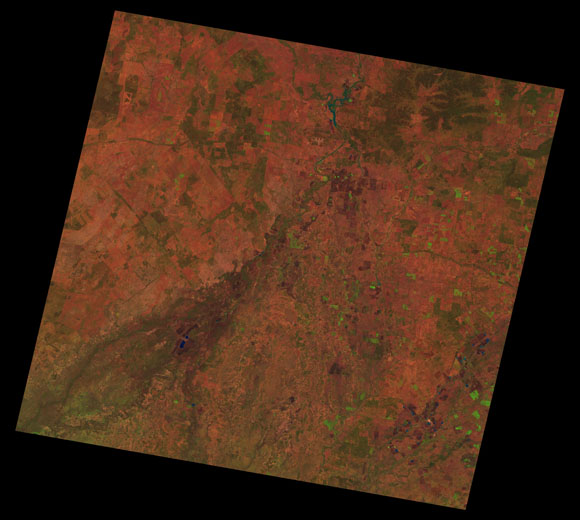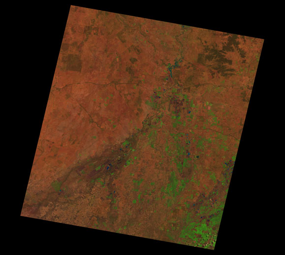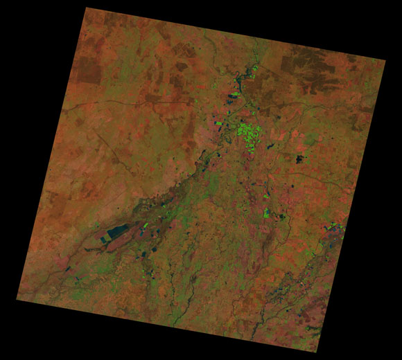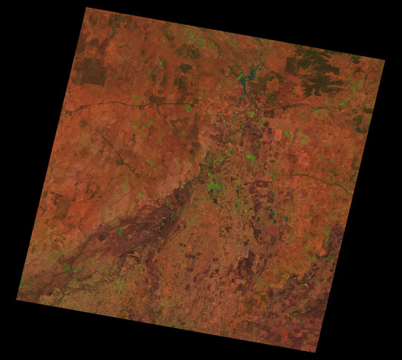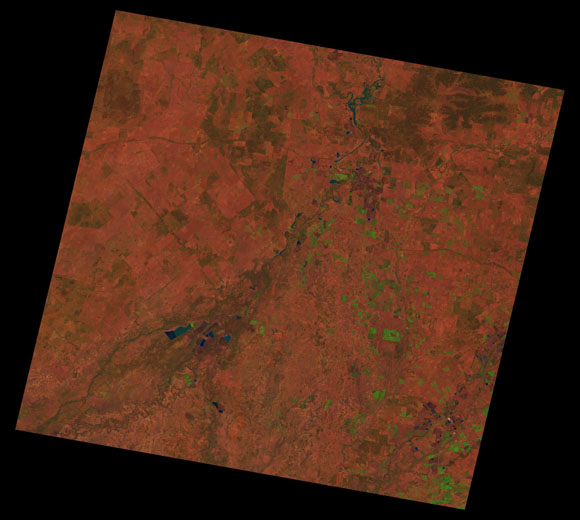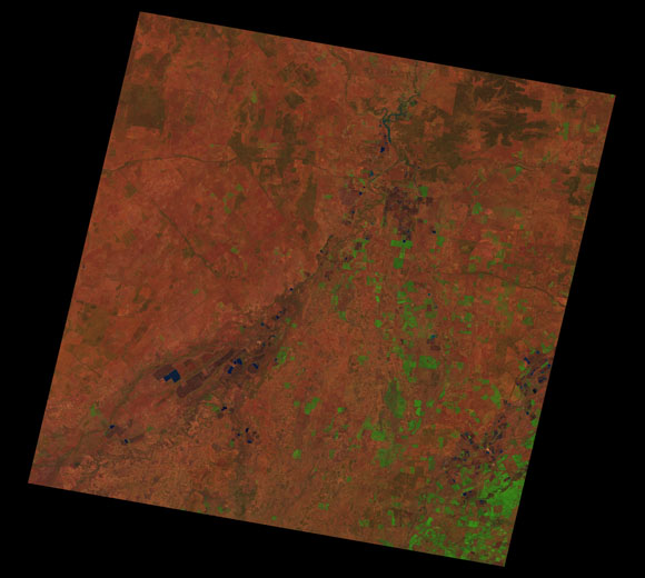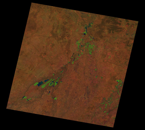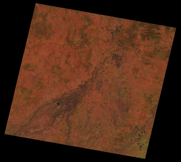 Dirranbandi Landsat SceneWRS path/row: 92/79-80 Images are colour-mapped to enhance the contrast of water bodies (Shortwave→Red, Near-infrared→Green, Green→Blue) Copyright Commonwealth of Australia - Geoscience Australia. Imagery post-processed by DETSI. This page should be cited as: Department of the Environment, Tourism, Science and Innovation, Queensland (2013) Dirranbandi Landsat Scene, WetlandInfo website, accessed 15 December 2025. Available at: https://wetlandinfo.detsi.qld.gov.au/wetlands/resources/tools/hydro-climate/scene/dirr/ |