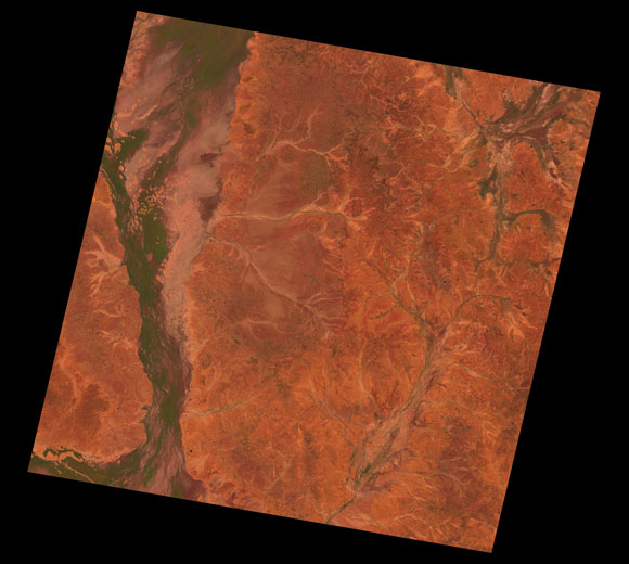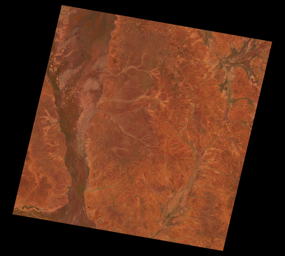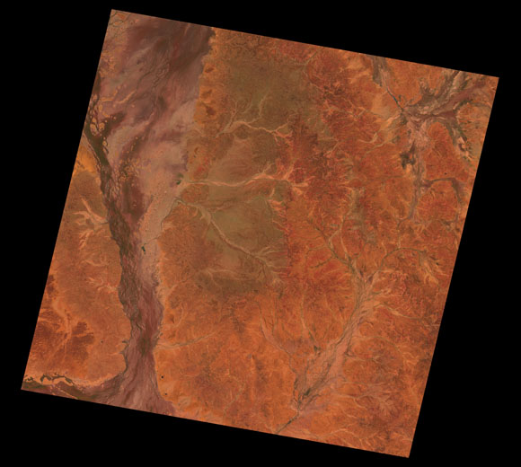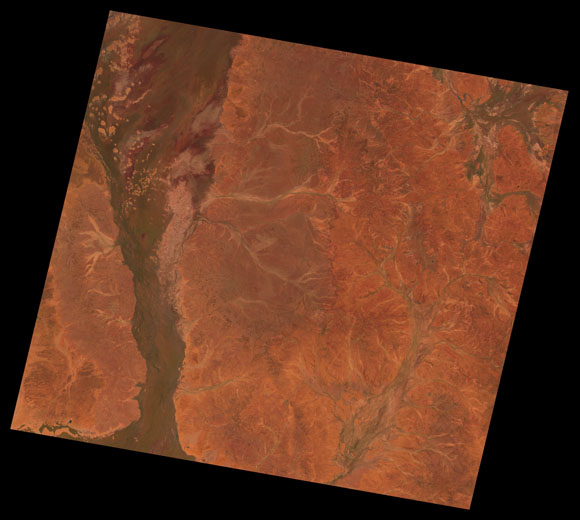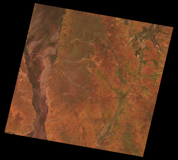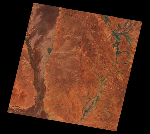 Eromanga Landsat SceneWRS path/row: 96/78-79 Images are colour-mapped to enhance the contrast of water bodies (Shortwave→Red, Near-infrared→Green, Green→Blue) Copyright Commonwealth of Australia - Geoscience Australia. Imagery post-processed by DETSI. This page should be cited as: Department of the Environment, Tourism, Science and Innovation, Queensland (2013) Eromanga Landsat Scene, WetlandInfo website, accessed 15 December 2025. Available at: https://wetlandinfo.detsi.qld.gov.au/wetlands/resources/tools/hydro-climate/scene/erom/ |