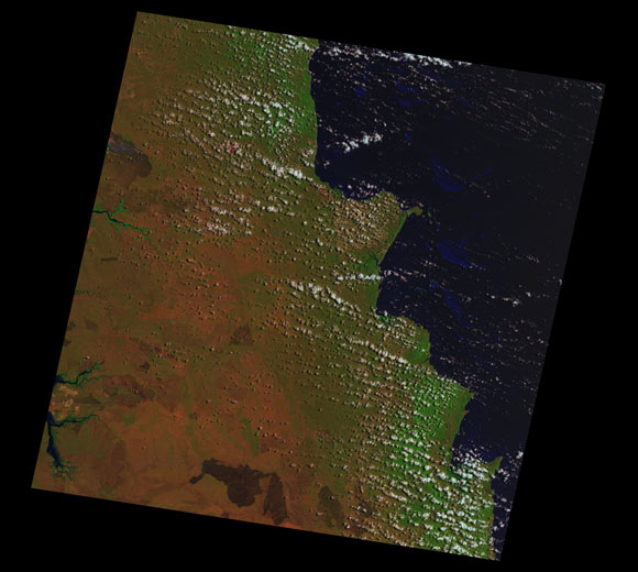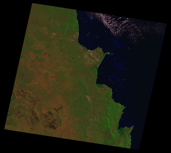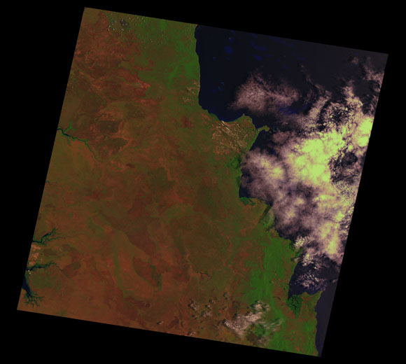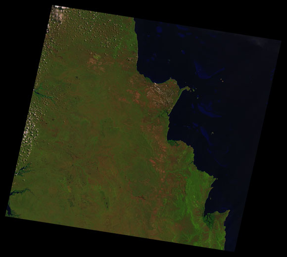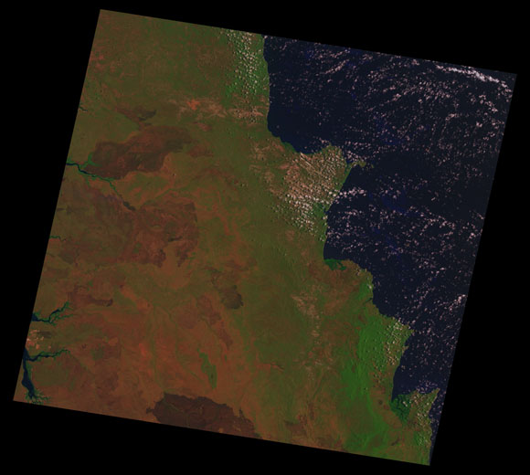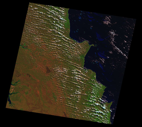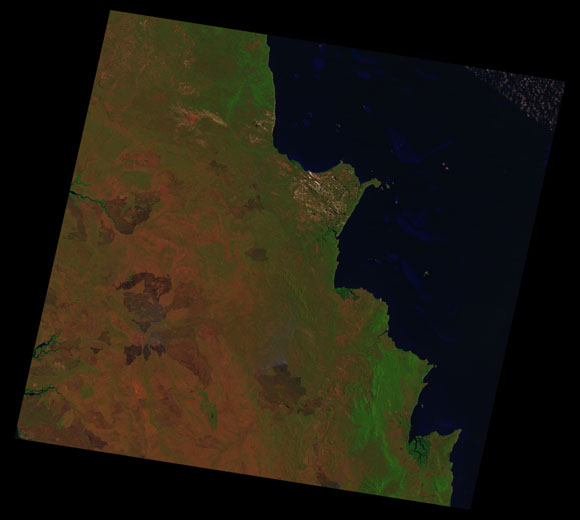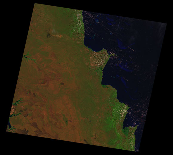 Iron Range Landsat SceneImages are colour-mapped to enhance the contrast of water bodies (Shortwave→Red, Near-infrared→Green, Green→Blue) Copyright Commonwealth of Australia - Geoscience Australia. Imagery post-processed by DETSI. This page should be cited as: Department of the Environment, Tourism, Science and Innovation, Queensland (2013) Iron Range Landsat Scene, WetlandInfo website, accessed 15 December 2025. Available at: https://wetlandinfo.detsi.qld.gov.au/wetlands/resources/tools/hydro-climate/scene/iron/ |