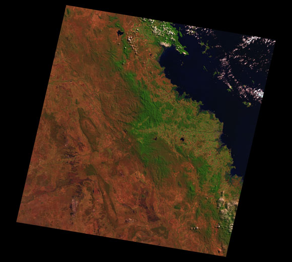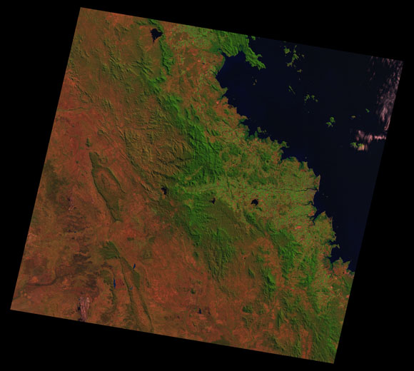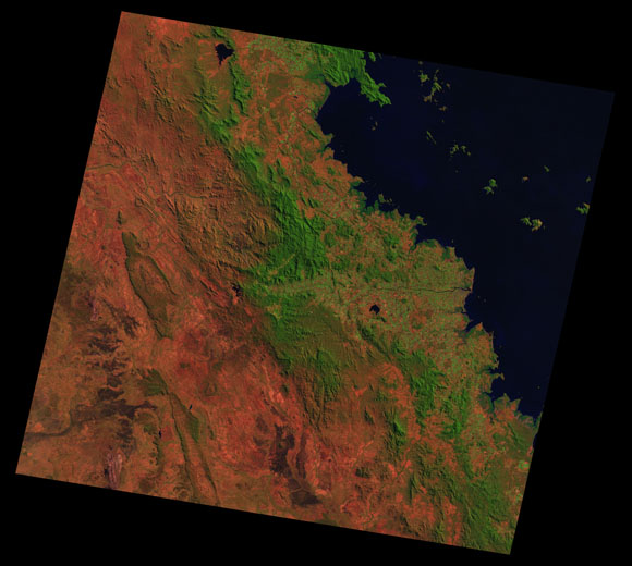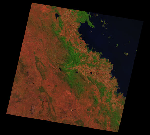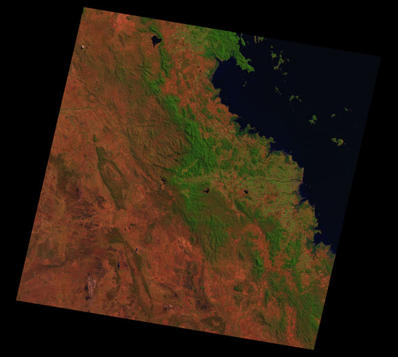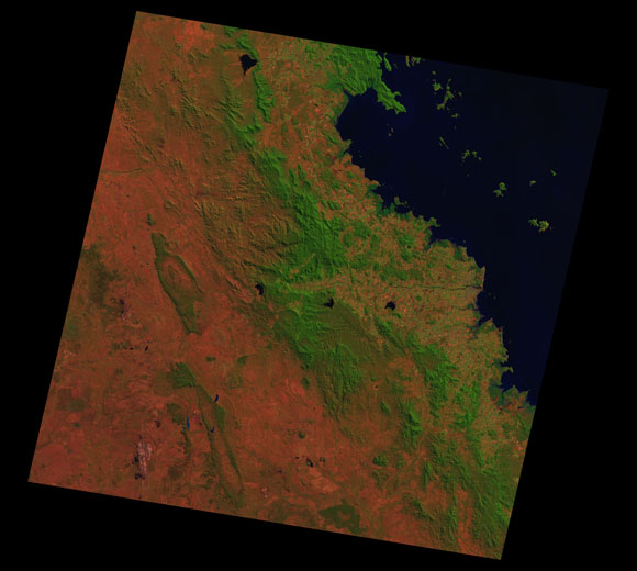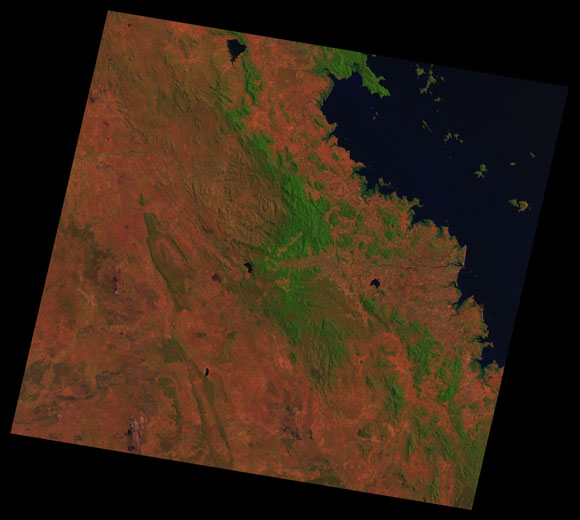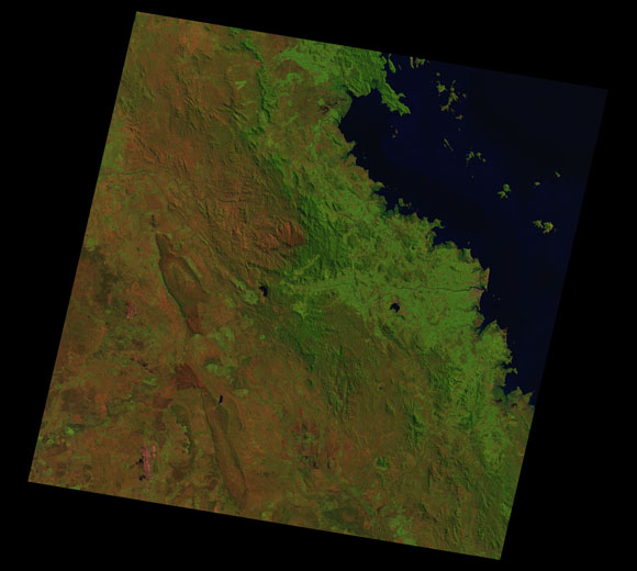 Mackay Landsat SceneWRS path/row: 93/74-75 Images are colour-mapped to enhance the contrast of water bodies (Shortwave→Red, Near-infrared→Green, Green→Blue) Copyright Commonwealth of Australia - Geoscience Australia. Imagery post-processed by DETSI. This page should be cited as: Department of the Environment, Tourism, Science and Innovation, Queensland (2013) Mackay Landsat Scene, WetlandInfo website, accessed 15 December 2025. Available at: https://wetlandinfo.detsi.qld.gov.au/wetlands/resources/tools/hydro-climate/scene/mack/ |