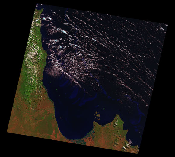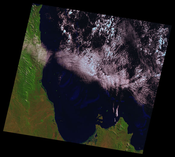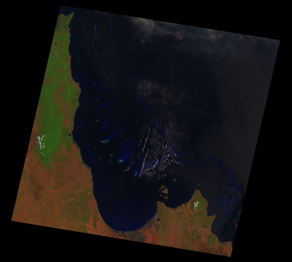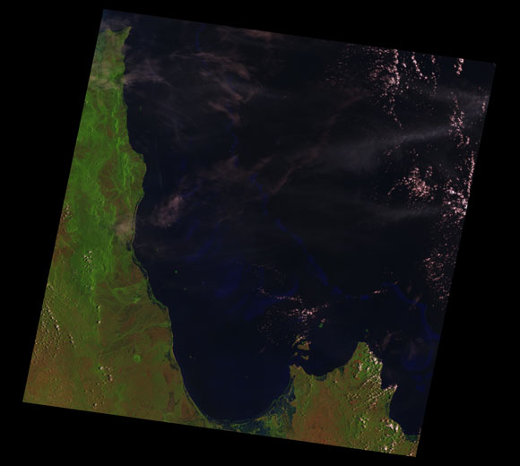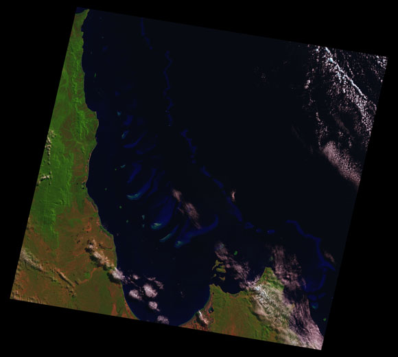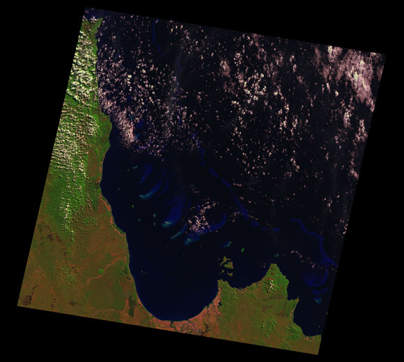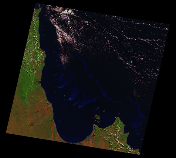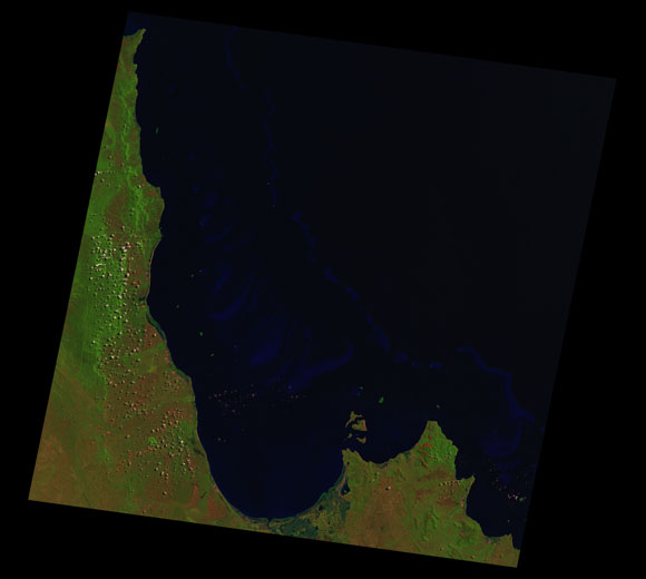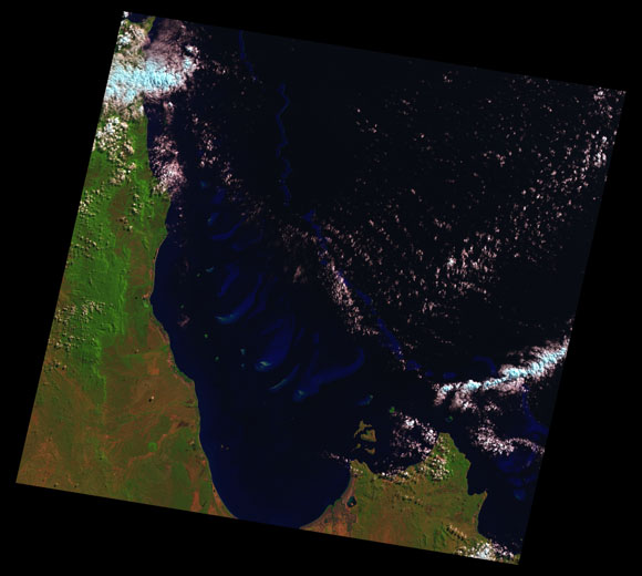 Princess Charlotte Landsat SceneImages are colour-mapped to enhance the contrast of water bodies (Shortwave→Red, Near-infrared→Green, Green→Blue) Copyright Commonwealth of Australia - Geoscience Australia. Imagery post-processed by DETSI. This page should be cited as: Department of the Environment, Tourism, Science and Innovation, Queensland (2013) Princess Charlotte Landsat Scene, WetlandInfo website, accessed 15 December 2025. Available at: https://wetlandinfo.detsi.qld.gov.au/wetlands/resources/tools/hydro-climate/scene/prin/ |