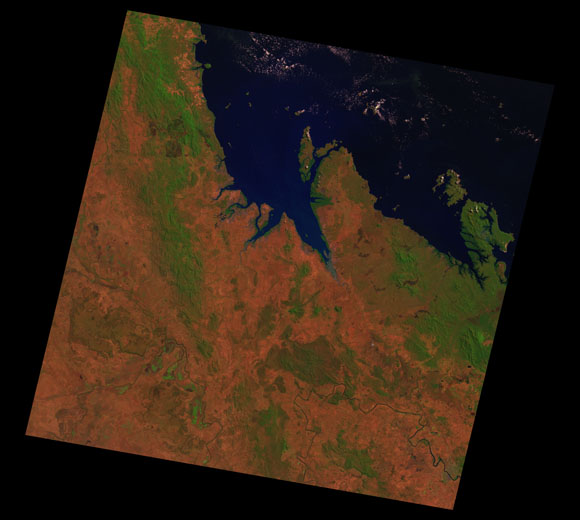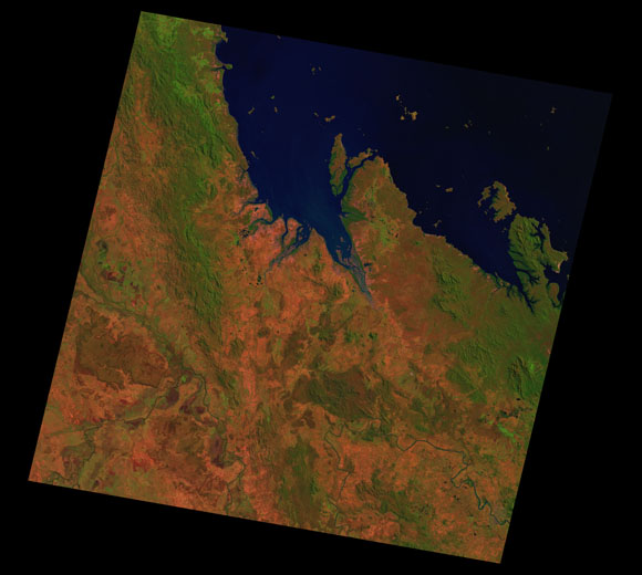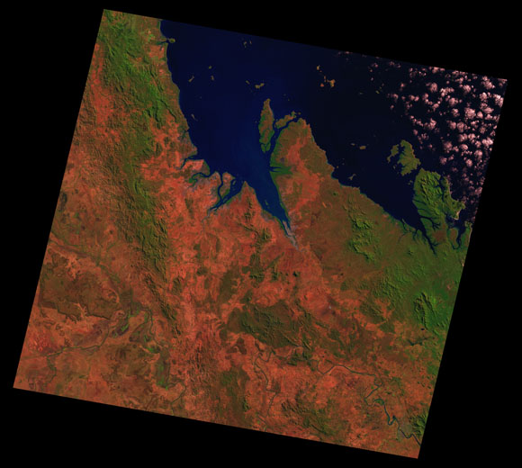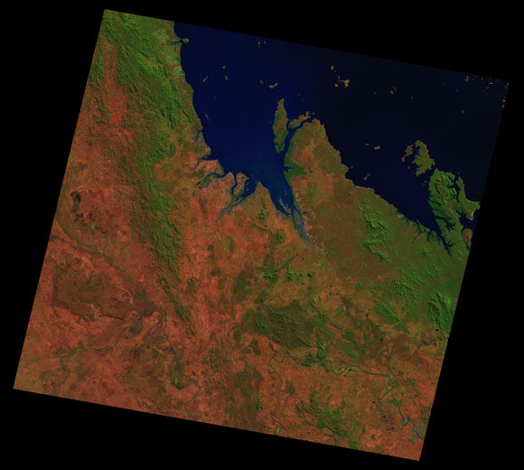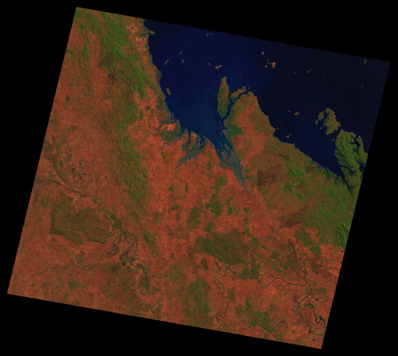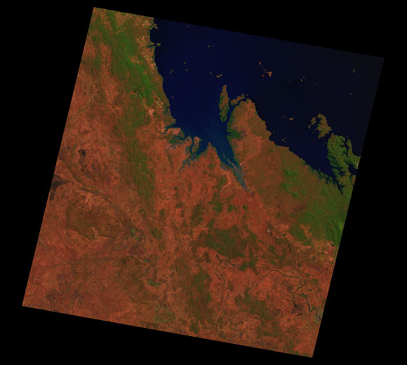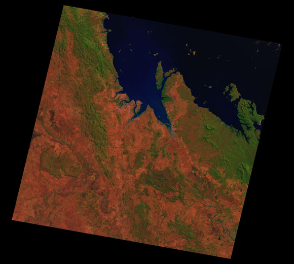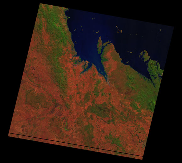 St Lawrence Landsat SceneImages are colour-mapped to enhance the contrast of water bodies (Shortwave→Red, Near-infrared→Green, Green→Blue) Copyright Commonwealth of Australia - Geoscience Australia. Imagery post-processed by DETSI. This page should be cited as: Department of the Environment, Tourism, Science and Innovation, Queensland (2013) St Lawrence Landsat Scene, WetlandInfo website, accessed 15 December 2025. Available at: https://wetlandinfo.detsi.qld.gov.au/wetlands/resources/tools/hydro-climate/scene/stla/ |