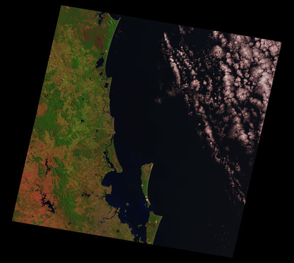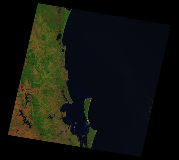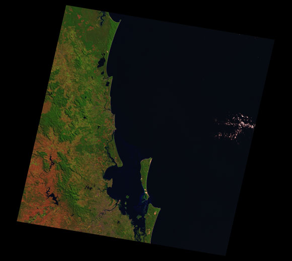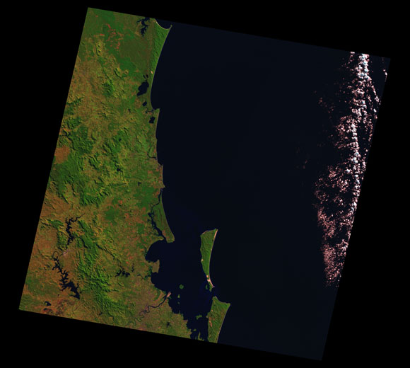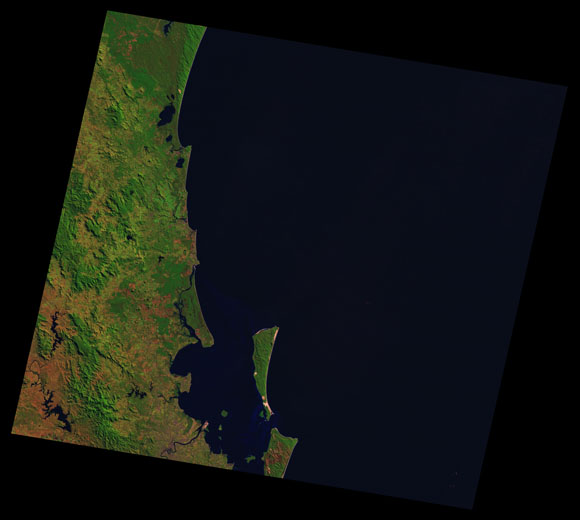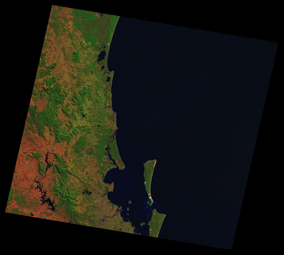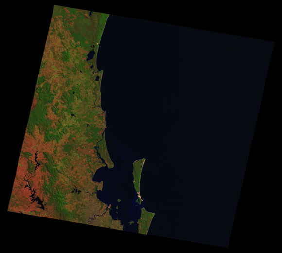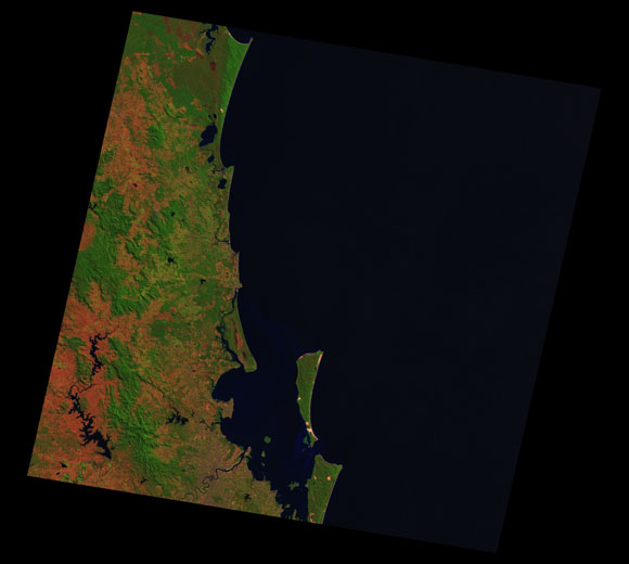 Sunshine Coast Landsat SceneWRS path/row: 89/78-79 Images are colour-mapped to enhance the contrast of water bodies (Shortwave→Red, Near-infrared→Green, Green→Blue) Copyright Commonwealth of Australia - Geoscience Australia. Imagery post-processed by DETSI. This page should be cited as: Department of the Environment, Tourism, Science and Innovation, Queensland (2013) Sunshine Coast Landsat Scene, WetlandInfo website, accessed 15 December 2025. Available at: https://wetlandinfo.detsi.qld.gov.au/wetlands/resources/tools/hydro-climate/scene/suns/ |