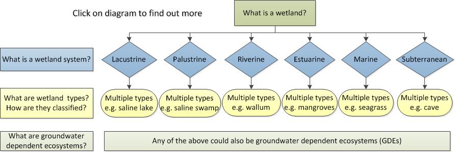 Definitions and classification'Wetland' is a broad term used for different kinds of wet ecosystems or ecosystems that are wet for a period of time. There are many definitions of wetlands in Queensland and which have been grouped into different types or classes based on their diversity, values and uses. Water in wetlands can be still or flowing; it can be fresh, salty or brackish. Inland rivers and coastal or marine areas with water up to 6m deep at low tide are also classified as wetlands. Wetlands can be natural, artificial or a mixture of both. A farm dam for example can be a wetland—but a swimming pool with artificial sides and bottom can not.