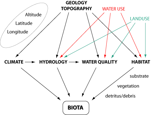 The Australian Drainage Divisions were used as a guide to divide the state into meaningful FBP. The rationale for this is that catchments from the same basin should be more ecologically similar to each other than to catchments in other basins[30], and therefore it is expected that faunal communities within the same drainage basin should be similar. The ANOSIM results of the catchment comparisons were then used to further refine stratification. To allow verification of classification outputs, macroinvertebrate and fish data were analysed independently. Both data sets supported the delineation of the same nine FBP boundaries. Identifying key ecosystem driversAn important step in the development of the Riverine Conceptual Models was the identification of all known drivers (including potential stressors) affecting Queensland's aquatic freshwater riverine ecosystems. Broadly these drivers can be considered in two categories: